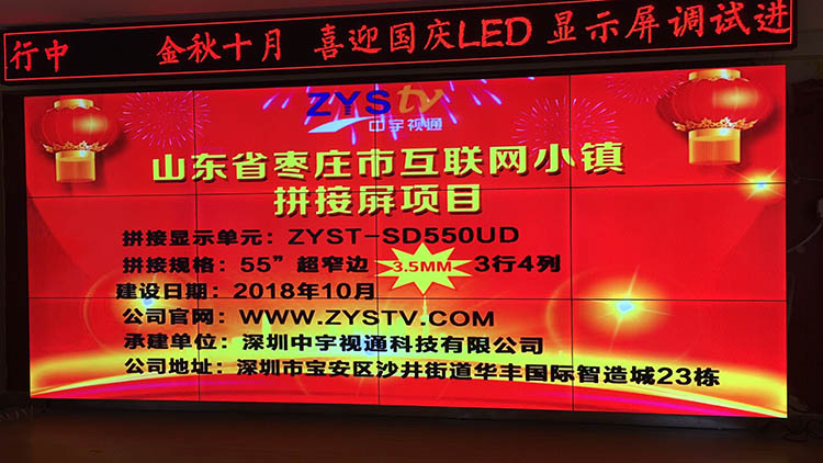山東棗莊市互聯(lián)網(wǎng)小鎮(zhèn)55寸超窄邊3.5mm3行4列液晶拼接屏項目,安裝調試完成并且順利驗收,中宇視通科技全體職工從深圳發(fā)來賀電!